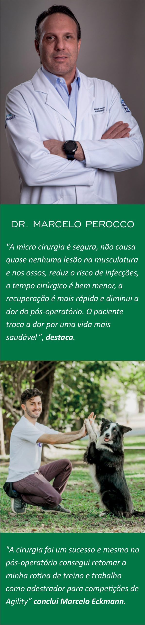 O especialista deve avaliar qual o tratamento mais indicado para cada paciente. Quando falamos em tempo de recuperação, todos tem a intenção de recuperar a agilidade o mais rápido possível, como é o caso de Marcelo Eckmann que tem uma rotina intensa de competições com seu cão. “A cirurgia foi um sucesso e mesmo no pós-operatório consegui retomar a minha rotina de treino e trabalho como adestrador para competições de Agility” conclui Marcelo Eckmann.