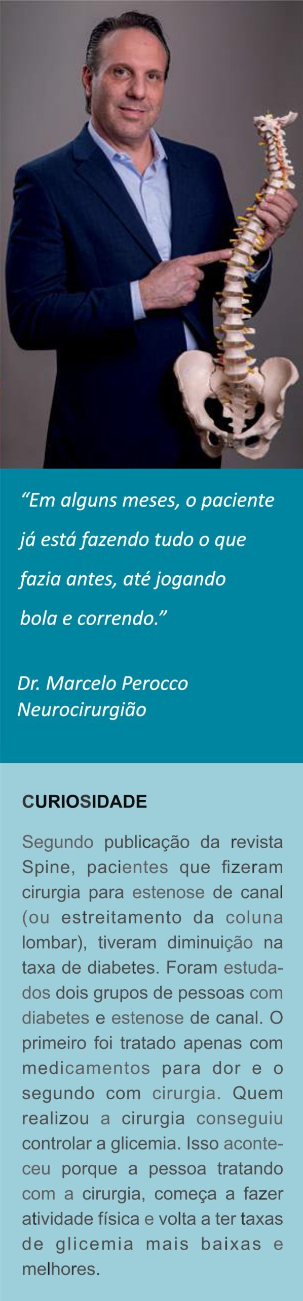 “A cirurgia que o Dirceu realizou, consiste em uma estabilização dinâmica da coluna lombar, indicada para correção de hérnia de disco e estabilização da coluna para pacientes jovens e atletas, pois mantém a mobilidade do segmento tratada. Em alguns meses, o paciente já está fazendo tudo o que fazia antes, até jogando bola e correndo’: explica Dr. Marcelo Perocco, neurocirurgião especialista em coluna.